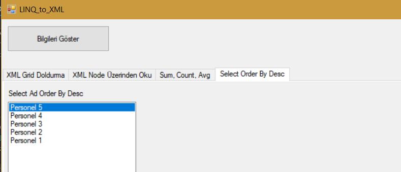 Şimdi XML dosyamıza 5 tane daha personel ekleyelim ve her departmanda iki personel olacak şekilde ayarlayalım. İşlemi yaptıktan sonra da kodlarımızı yazalım ve yine bir listbox’ta gösterelim.
