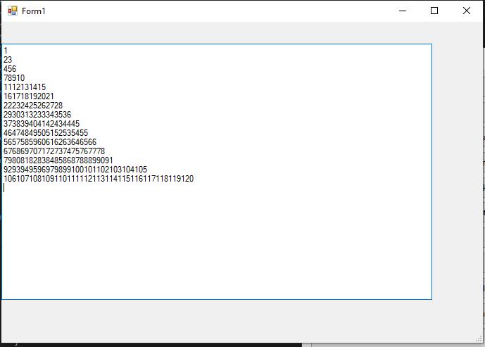 textBox1.Text += (string.Format("{0,3} ", ++s));String.Format kısmında 0 yazan yere oluşan yeni sayı geliyor. 3 ‘ün anlamı ise sayıdan sonra üç boşluk bırakmak oluyor. Aşağıdaki görselde nasıl göründüğünü görebilirsiniz. İlk olarak direk eşitleme ile nasıl göründüğüne bakalım. Yani String.Format kullanmadan nasıl olacak.
